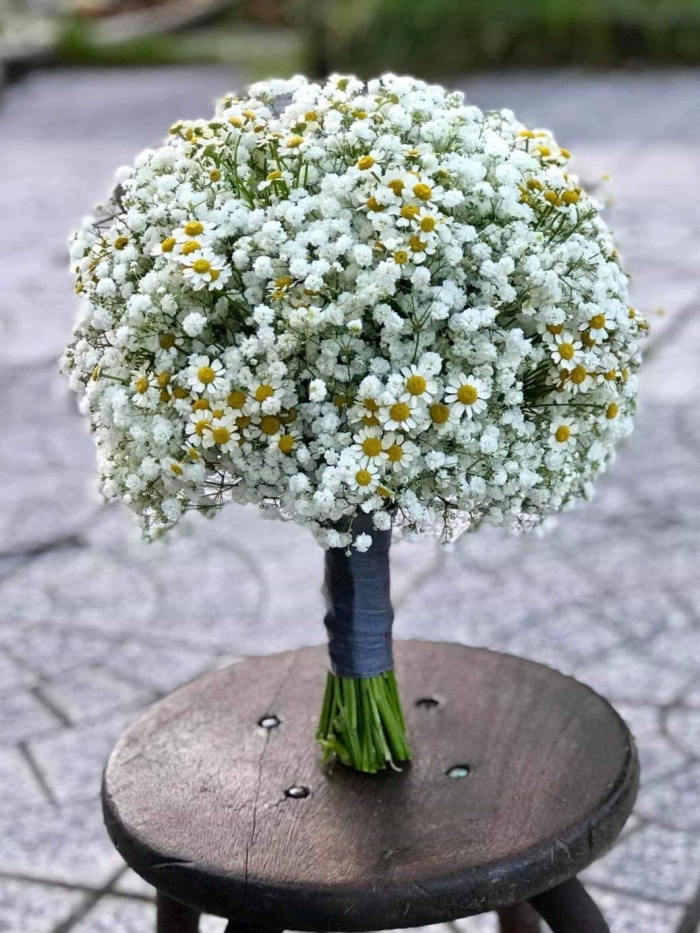 Bó hoa cầm tay hoa baby kết hợp với hoa cúc là lựa chọn phổ biến cho những cô dâu muốn tạo nên một bó hoa tươi sáng và rực rỡ. Hoa cúc có màu sắc đa dạng và mang ý nghĩa của sự tươi mới và may mắn. Kết hợp với hoa baby, bó hoa trở nên nhẹ nhàng và tươi tắn hơn, đem lại cho cô dâu một vẻ đẹp tươi trẻ và rạng rỡ trong ngày trọng đại.